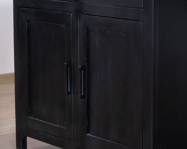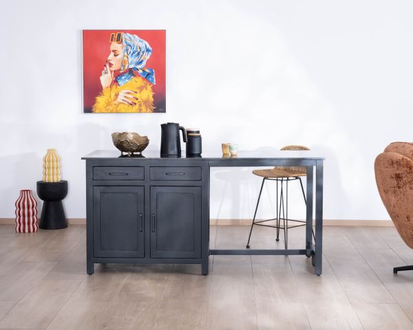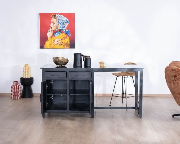Con il suo colore nero intenso, i frontali in legno massiccio di mango e lo spesso piano in granito, questa isola da cucina "Grand Chef" con zona pranzo è una dichiarazione audace e contemporanea. Progettata per cucine aperte e spazi abitativi conviviali, è attraente sia per il suo design audace che per la sua eccezionale funzionalità. Con i suoi armadi passanti e i quattro cassetti su entrambi i lati, quest'isola centrale in mango massiccio e pietra naturale offre un'impressionante quantità di spazio di archiviazione, ideale per tenere tutto a portata di mano. Un centrotavola dal look industrial chic tanto pratico quanto elegante.