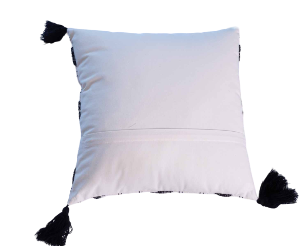 Gli angoli di questo cuscino bianco sono rifiniti con nappe nere, che aggiungono un tocco di fantasia al vostro arredamento. Le nappe aggiungono una texture diversa ai motivi ricamati, rendendoli ancora più attraenti.