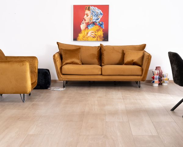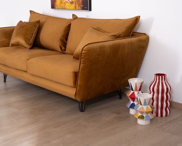 Rivestito in un tessuto ocra dal tocco vellutato, il grande divano a 3 posti "Hasting" è incredibile! Che sia collocato in un interno industriale o in un colorato salotto latino alla Frida Kahlo, farà sicuramente scalpore! Con un pezzo d'arredamento così unico, potrete creare un salotto che è proprio come voi: vivace, audace e ultra accogliente.