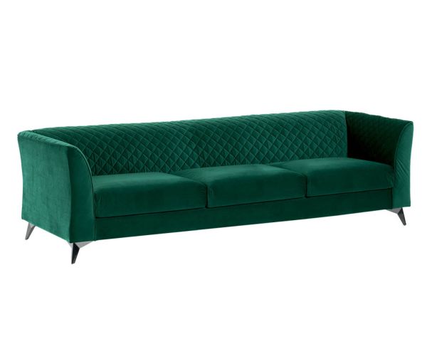 Volete dare un tocco vintage e originale al vostro salotto? Scegliete questo divano verde abete in tessuto 100% poliestere. Può ospitare 3 persone. Potrete condividere bei momenti con la vostra famiglia davanti alla televisione, seduti comodamente su questo divano. Questo modello è disponibile in diversi colori. Le sottili gambe in metallo aggiungono un tocco di modernità. Lo schienale e i braccioli hanno un effetto trapuntato.