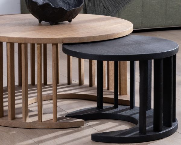 I due tavolini, con finitura sabbiata, offrono un contrasto visivo dalla grafica accattivante: il tavolino più grande è rifinito nella calda tonalità naturale del legno, mentre quello più piccolo è verniciato di nero, un colore che trasmette chic e modernità.