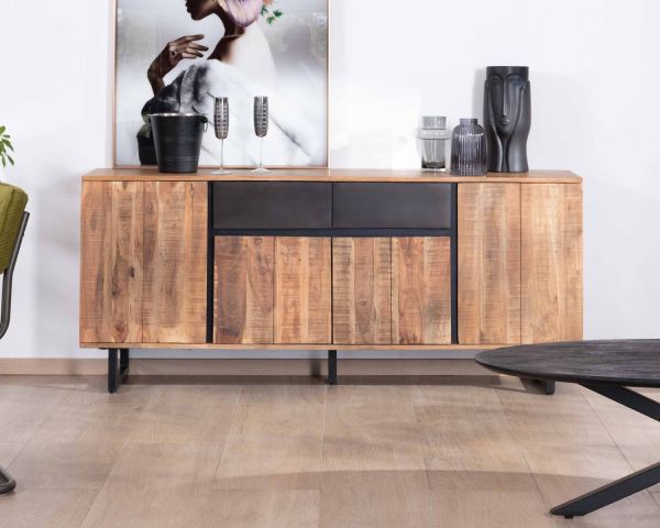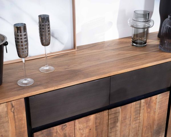 Scoprite l'eleganza contemporanea dell'enfilade in acacia e metallo della collezione "Bennett". Questo mobile, lungo 175 cm, unisce la bellezza naturale dell'acacia alla modernità del metallo nero. La base a U sostiene il corpo robusto e durevole della credenza, evidenziando il contrasto tra il calore del legno e la finitura moderna e grafica del metallo.