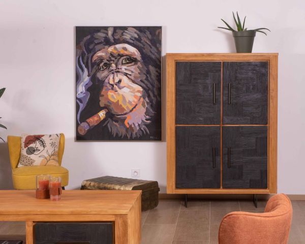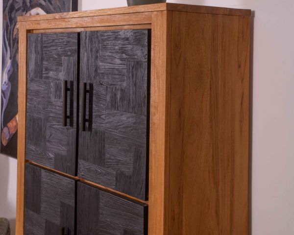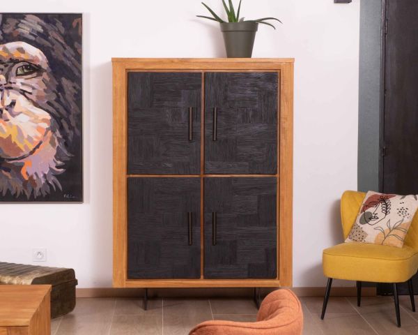 Per arredare la vostra sala da pranzo con grazia e disinvoltura, provate questa credenza verticale in teak massiccio recuperato. Con le sue 4 ante strutturate, la credenza in legno offre un singolare contrasto tra il nero profondo dei suoi frontali e le sfumature naturali del materiale esotico. Lunga 111 cm e alta 155 cm, questa credenza è rifinita nei minimi dettagli. Le maniglie e le gambe in metallo aggiungono il giusto tocco di finitura di fabbrica. Appoggiato comodamente sulle sue gambe robuste, questo mobile durevole vi regalerà molti anni di utilizzo senza problemi in cucina o in salotto. Dietro le quattro ante, si trova un ripiano che divide ogni mobile in due scomparti per aumentare lo spazio di archiviazione. Sia che lo usiate quotidianamente, sia che lo usiate occasionalmente per le riunioni di famiglia domenicali, sarà un piacere aprire e chiudere ogni anta per estrarre e riporre bicchieri, piatti, scatole di dolci e così via.