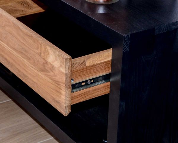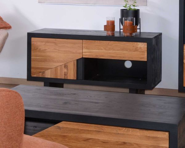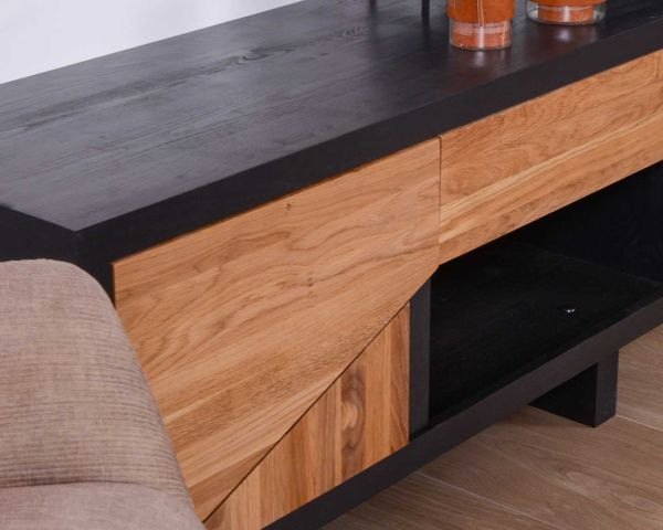 Il mobile TV "Flix" è un perfetto esempio di design moderno, efficace e accogliente. La combinazione di due tipi di legno massiccio e di due colori contrastanti garantisce il design contemporaneo di questo mobile.