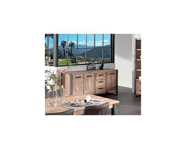 Ha tre ante su entrambi i lati di un blocco di tre cassetti. È realizzata in legno massello spazzolato con finitura cerulea e maniglie e piedini in metallo, che le conferiscono un aspetto contemporaneo o industriale di grande tendenza. È abbastanza grande e robusto da contenere tutte le stoviglie e la biancheria da tavola di una sala da pranzo o di un soggiorno. I cassetti, montati su binari, scorrono facilmente per riporre posate o riviste, facilitando il riordino dello spazio abitativo. Questa lunga credenza è particolarmente pratica per l'uso quotidiano e rappresenta un vero vantaggio in termini di organizzazione.
