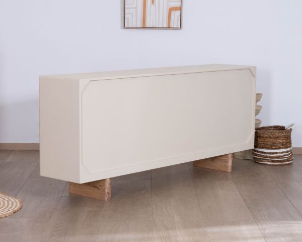 Struttura e ripiani in MDF dalle linee morbide e pulite, con finitura in cemento sabbiato ed effetto pietra strutturata al tatto