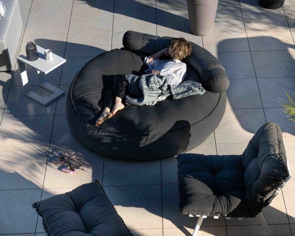Con un diametro di 1m80, questo mobile da esterno si presenta come un voluminoso cuscino sul quale sognerete di rilassarvi da soli o in coppia sulla sua superficie accogliente e generosa.