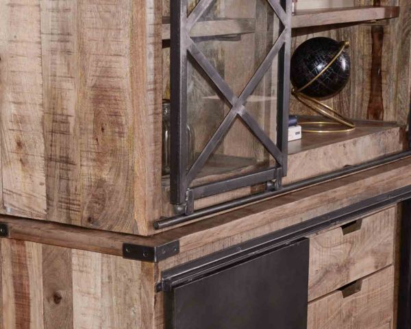 Leggero e di facile manutenzione, il legno di mango con il suo bel colore marrone chiaro e le sue molteplici sfumature di miele aggiunge un tocco di luminosità. Crea un elegante contrasto con l'acciaio delle ante e dei vari pannelli frontali e posteriori, rafforzando l'effetto industriale del vostro arredamento. Con l'aspetto maestoso del suo cornicione e i suoi dettagli accuratamente progettati, il vostro nuovo mobile di famiglia è prezioso e di tendenza.