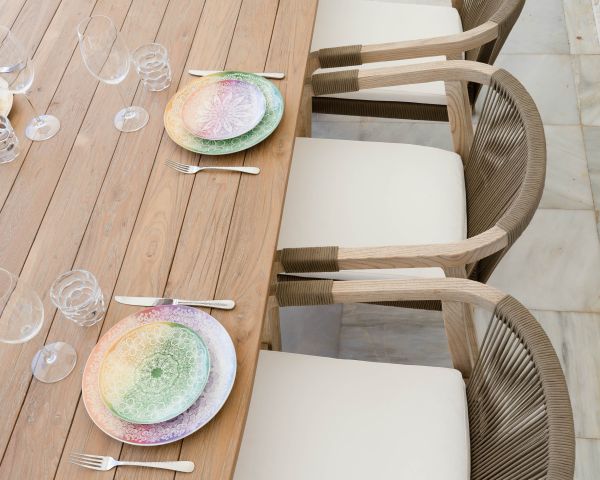 Il legno di teak è naturalmente impermeabile e imputrescibile. Inoltre, il design del tavolo con le sue doghe leggermente aperte permette di lavorare il legno senza danneggiarlo. Nel corso delle stagioni e con l'esposizione al sole e alle intemperie, il teak può assumere tonalità grigie. Per preservare la lucentezza originale del teak e proteggerlo da eventuali tracce d'acqua, è possibile oliarlo di tanto in tanto con un prodotto adatto, una o due volte l'anno a seconda dell'utilizzo. Se non lo si usa per molto tempo, è meglio riporre i mobili al coperto.