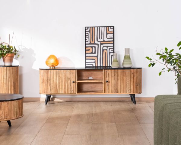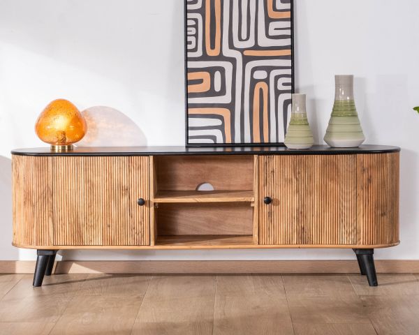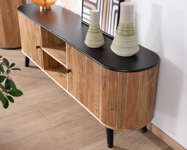 Con la sua silhouette arrotondata e i suoi contrasti decisi, il porta TV "Boogie" in acacia bicolore aggiungerà una vera e propria firma decorativa al vostro salotto. L'abbinamento tra il legno di acacia naturale a grana sottile e il nero intenso dei frontali e delle gambe crea un look moderno e retrò che è allo stesso tempo caldo e grafico.