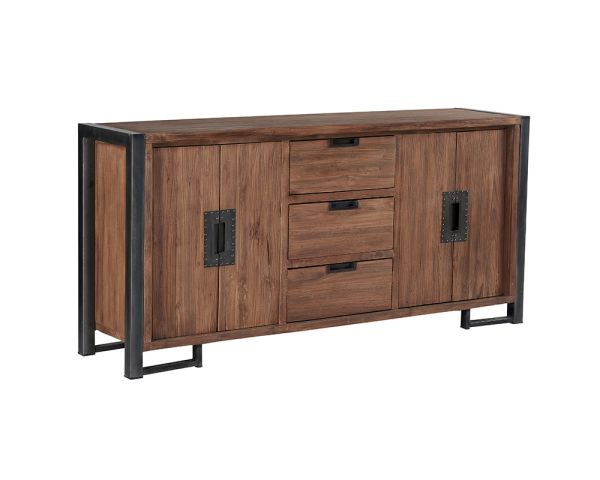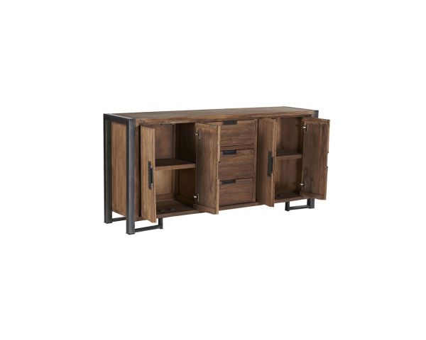 Bellissima credenza in teak massiccio spazzolato con finitura miele, gambe e maniglie in metallo.