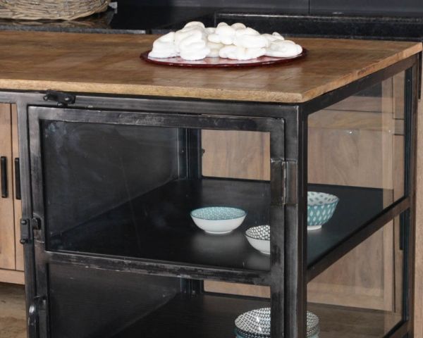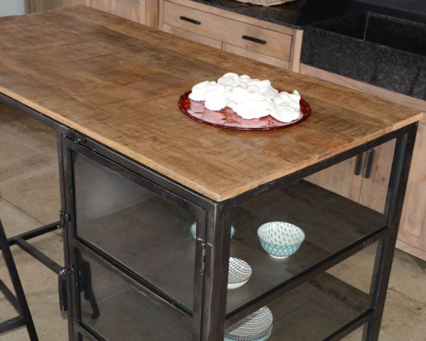 Con dimensioni di 150 cm x 73 cm (escluse le maniglie, di 4 cm ciascuna) x 93 cm, il vostro nuovo mobile da cucina è dotato di un vano portaoggetti vetrato e di un superbo piano in esotico legno di mango. Ideale per tagliare le verdure o sorseggiare una tazza di caffè, l'isola diventerà il fulcro della vostra cucina.