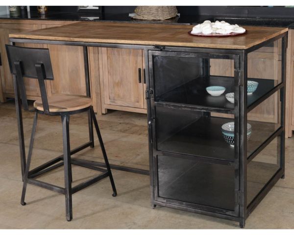 Con i suoi quattro sgabelli in stile vintage o factory, il mobile in metallo, vetro e legno sarà il luogo perfetto per trascorrere momenti indimenticabili in compagnia. Sarete felici di usarlo ogni giorno, sia con i vostri figli che con i vostri amici. Facile da mantenere, non dovrete fare alcuno sforzo particolare, a parte passare la cera sul legno una o due volte all'anno. Tanto robusto quanto ergonomico, potrete riporre le vostre belle stoviglie e i barattoli delle spezie al riparo dalla polvere. Dietro le ante in vetro, saranno sempre a portata di mano. Ideale per chi ama intrattenersi e cucinare.