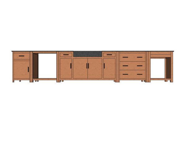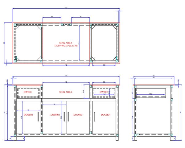 Il piano di lavoro misura 164x63 cm. È progettato per estendersi oltre il mobile in legno e viene consegnato separatamente in modo da poter essere regolato, se necessario, come per una credenza sul retro.