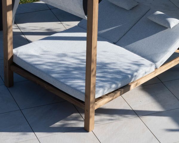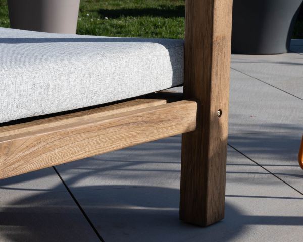 Il teak è un legno durevole, resistente e imputrescibile, grazie al suo contenuto naturale di olio, che lo rende particolarmente adatto all'uso nei mobili da esterno. Inoltre, in fase di progettazione viene trattato appositamente per l'uso esterno. Tuttavia, con il passare delle stagioni e con l'esposizione al sole e alle intemperie, il teak può assumere tonalità grigie, il che non pregiudica in alcun modo la forza e la resistenza dei vostri mobili. Per evitarlo, vi consigliamo di effettuare una manutenzione stagionale con un detergente speciale per il teak e un olio dedicato a questo tipo di legno, per nutrirlo e mantenere il suo naturale colore dorato.