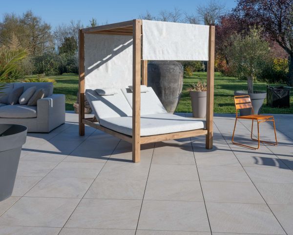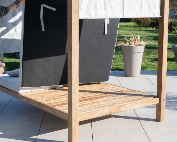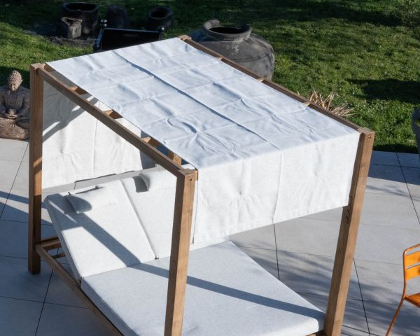 Lo speciale tessuto per esterni utilizzato per questi mobili da giardino è progettato per resistere ai raggi UV, allo sbiadimento e alle macchie. È idrorepellente e resiste alla pioggia leggera. In caso di maltempo o se il mobile non viene utilizzato per molto tempo, si consiglia di riporre il materasso e il baldacchino al chiuso.