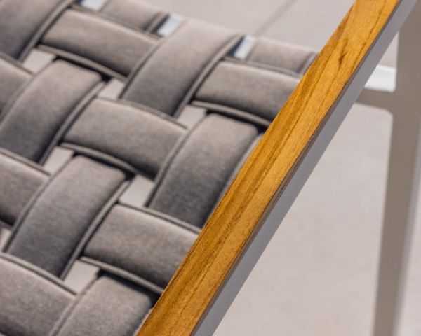 I braccioli, rivestiti in teak, aggiungono un tocco caldo e chic alla sedia e la rendono accogliente. Naturalmente resistente e adatto all'uso esterno, il legno di teak è apprezzato anche per le sue venature sottili, che invitano alla fuga.