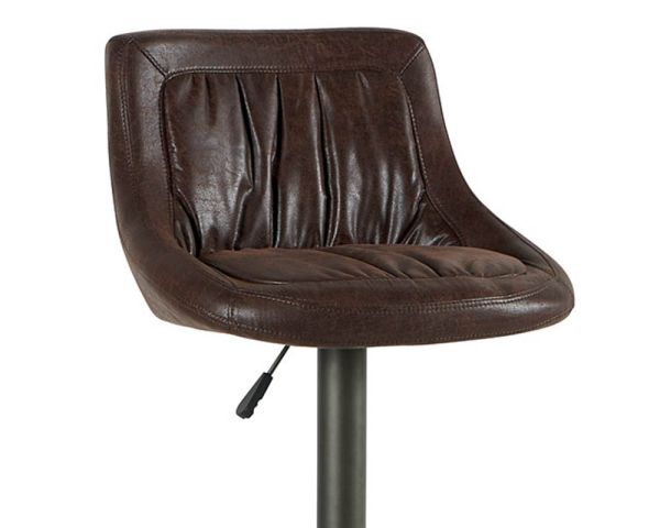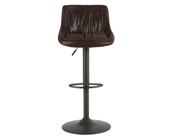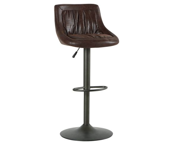 Sgabelli in stile industriale con altezza regolabile. Molto pratici, questi sgabelli possono essere facilmente regolati per essere utilizzati a livello del bar o all'altezza giusta per l'isola della cucina. Questi sgabelli hanno una finitura marrone e una struttura in ferro laccato.