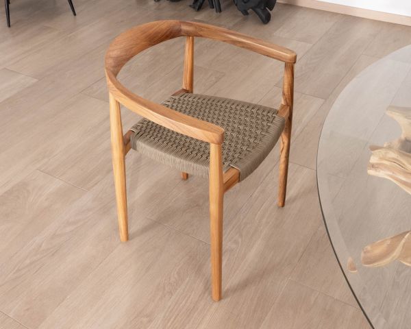 Realizzate in legno di teak tinto nei ricchi toni dell'acacia, queste sedie con braccioli hanno un fascino caldo e la profondità del colore del legno è elegantemente evidenziata dallaseduta in corda color tortora. La combinazione di questi colori sobri e caldi e la curvatura avvolgente dello schienale ispirano comfort e piacere nelle serate estive in terrazza.