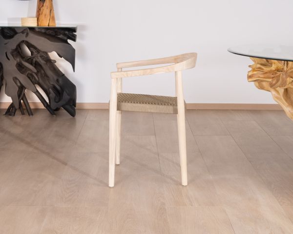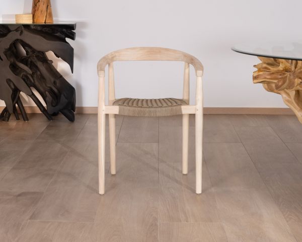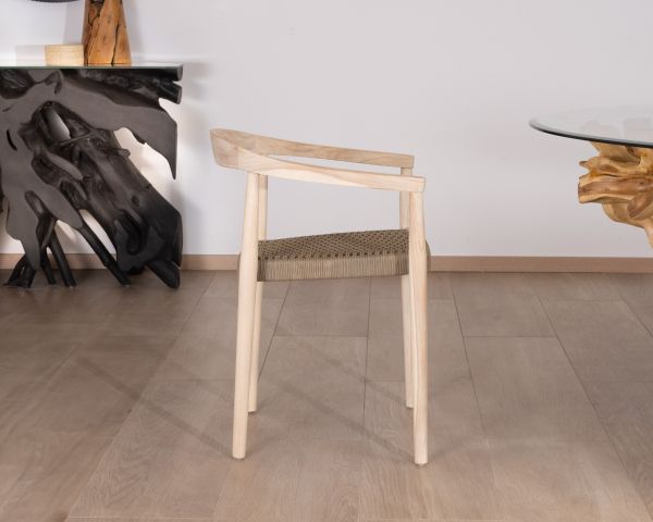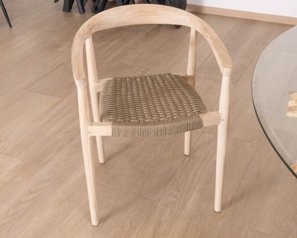 Queste sedie in teak con seduta in corda intrecciata color marrone tortora hanno un aspetto contemporaneo con un tocco etnico grazie alla combinazione di questi materiali naturali in toni sobri.