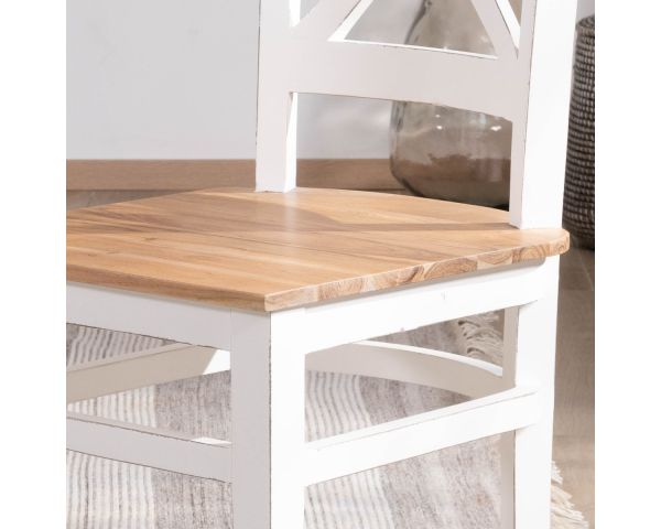 La struttura della sedia è dipinta di bianco, un colore che trasmette chiarezza e rinfrescante eleganza. La voluta patinatura conferisce a questo mobile l'autentico cachet dei mobili di famiglia ricchi di storia, o trovati qua e là.