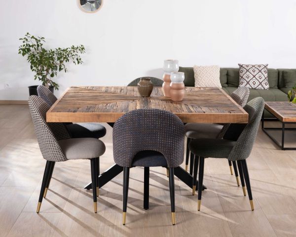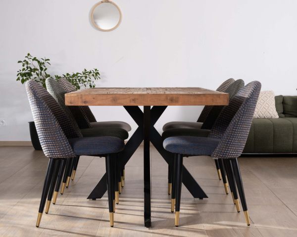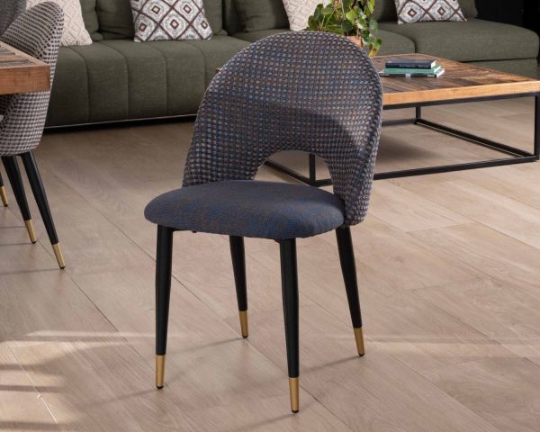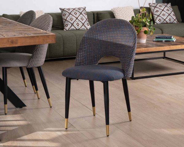 Lasciatevi sedurre dal fascino della sedia da pranzo "Vermont" in tessuto blu scuro e grigio. Con il suo look raffinato, impreziosito da gambe affusolate in metallo nero completate da punte dorate, porterà una delicata eleganza nella vostra sala da pranzo.