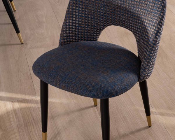 Questa sedia da pranzo in tessuto blu scuro e gambe in metallo è disponibile in una vasta gamma di colori, da quelli più sobri a quelli più allegri, ed è disponibile sul nostro sito nel resto della collezione "Vermont". Potrete creare un'atmosfera che rispecchi la vostra immagine combinandoli in modo giocoso o sobrio, come preferite!