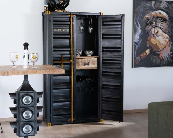 Il mobile bar contenitore a due ante della collezione "Crazy" vi farà viaggiare nel cuore del vostro salotto nelmondo dei moli. All'incrocio tra puro stile industriale e riciclato, questo mobile in metallo è realizzato a mano con materiali riciclati e ha un carattere autentico in cui le piccole imperfezioni, le ammaccature e i graffi hanno il loro posto. Ogni pezzo porta una firma unica, una storia che siete liberi di interpretare come un'opera d'arte.