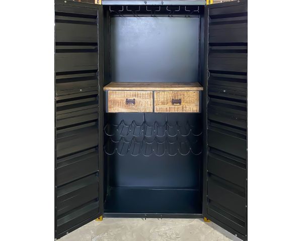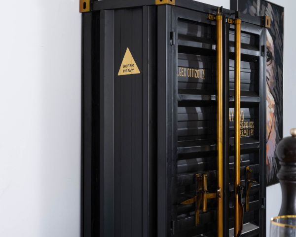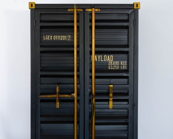 Con un ingombro di soli 177 cm per 92 cm, questo contenitore da bar in metallo nero trasmette un'impressione di forza e robustezza, elegantemente sottolineata dalle scritte in oro e dai catenacci cremonesi sulle due ante, che sembrano contenere contenuti preziosi.
