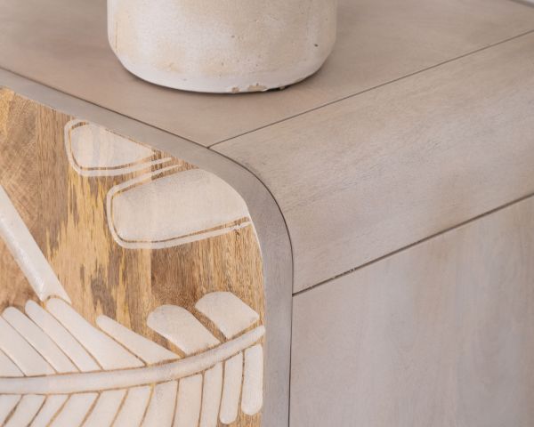 La forma arrotondata di questo mobile contenitore a 3 ante, unita al colore sbiancato del legno, aggiungerà un tocco fresco e morbido ai vostri interni. Il legno massiccio di mango, materiale rinomato per il suo fascino, la sua resistenza e la sua durata, è qui abbinato al metallo con finitura dorata per creare un insieme tanto delicato quanto originale.