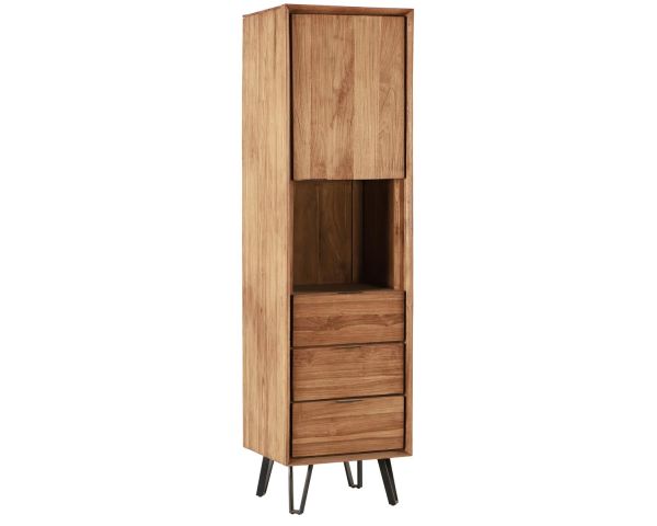 Questa colonna è un mobile facile da collocare in casa per riempire una parete o fornire un ulteriore spazio di archiviazione senza occupare troppo spazio. È realizzata in solido teak naturale. I suoi cassetti scorrono su guide metalliche per un comfort quotidiano. Anche le gambe sono in metallo. È il complemento perfetto della collezione Mocula. In termini di stile, si colloca all'incrocio tra lo spirito scandinavo e le nuove tendenze del legno grezzo e dell'ambiente naturale.
