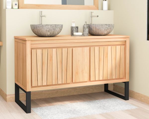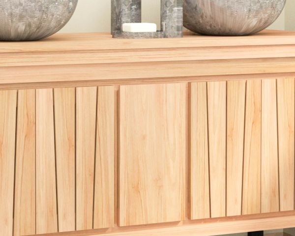 Realizzato in legno massiccio di teak, particolarmente adatto all'uso in ambienti umidi grazie alla sua resistenza all'acqua, il vostro grande mobile doppio sarà in grado di sostenere due grandi lavabi per un comfort e una facilità di utilizzo quotidiano e nel tempo.