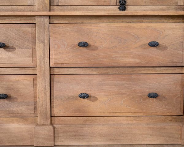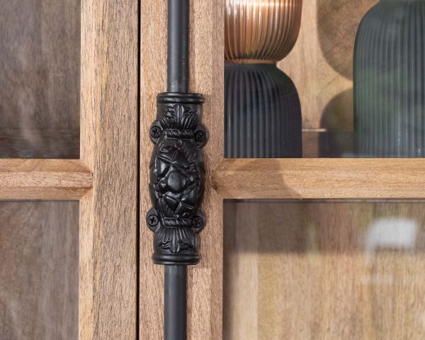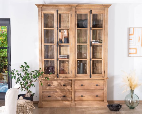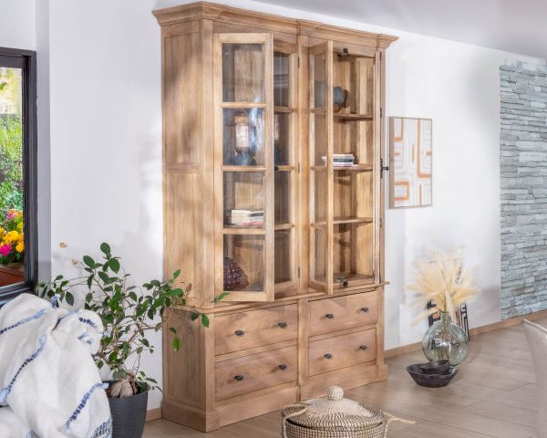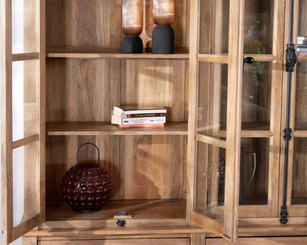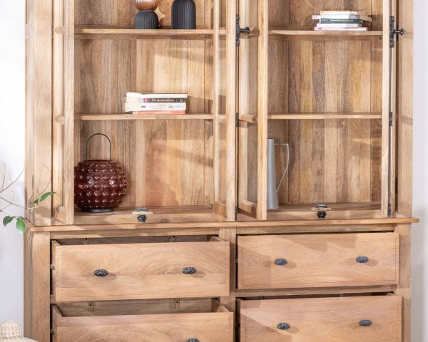 Versatile, con armadi smaltati e ampi cassetti, questo grande mobile contenitore in legno di mango occupa pochissimo spazio grazie alla profondità contenuta di 45 cm e alle ante in vetro che lasciano che i giochi di luce sublimino le sfumature del legno.