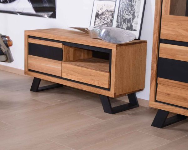 Ravvivate il vostro arredamento con lo stile moderno di questo mobile TV naturale e nero. La collezione "Toly" è stata progettata appositamente per gli amanti del legno che desiderano mobili di tendenza con un tocco di autenticità. Realizzato in rovere massiccio oliato e MDF tinto di nero, questo mobile presenta una nicchia, un cassetto e un piedistallo chiuso da un'anta, e aggiungerà sicuramente carattere al vostro salotto.