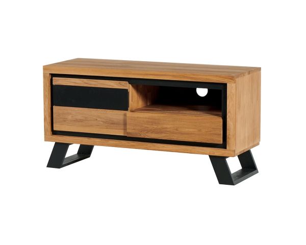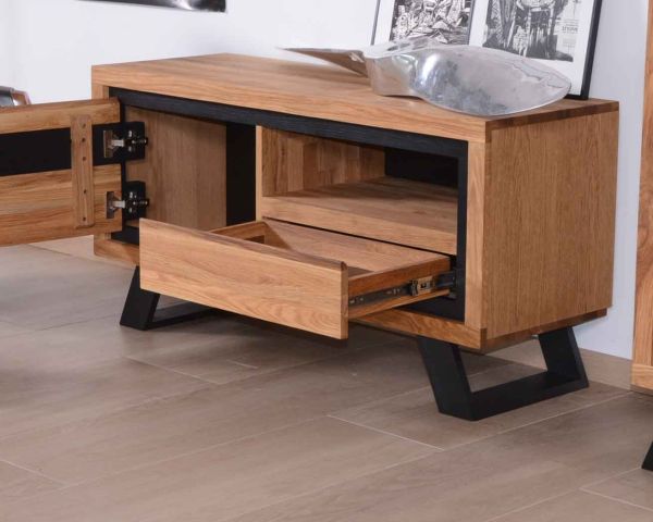 Questo piccolo mobile in legno è visivamente molto grafico e ha un design facile da vivere. Non trovate che le gambe e i dettagli neri rafforzino il potere decorativo del legno naturale? Questo mobile TV, lungo 114 cm, alto 53 cm e profondo 40 cm, dispone anche di un ampio spazio di archiviazione. La nicchia aperta è dotata di un foro per la gestione dei cavi che consente di far passare i fili delle apparecchiature lungo lo schienale. Il cassetto, montato su guide metalliche e completamente apribile, consente di riporre telecomandi e joystick in modo da sapere sempre dove si trovano. L'anta frenata è ideale per riporre DVD, giochi da tavolo, ecc.