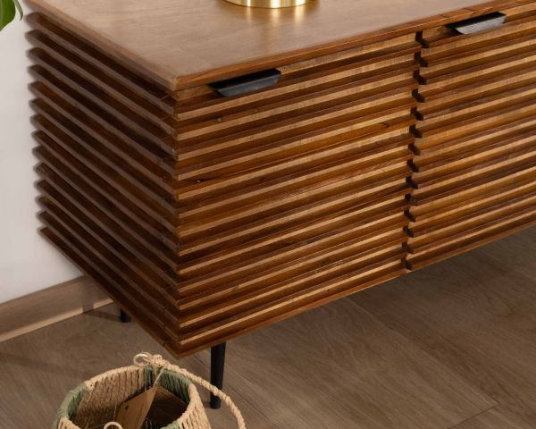 Con i suoi frontali in finitura goffrata, questo mobile TV in legno massiccio e metallo ha un fascino ipnotico e originale. Le linee orizzontali del motivo sottolineano la lunghezza del mobile, alleggerendo l'ingombro visivo e aggiungendo un tocco grafico.