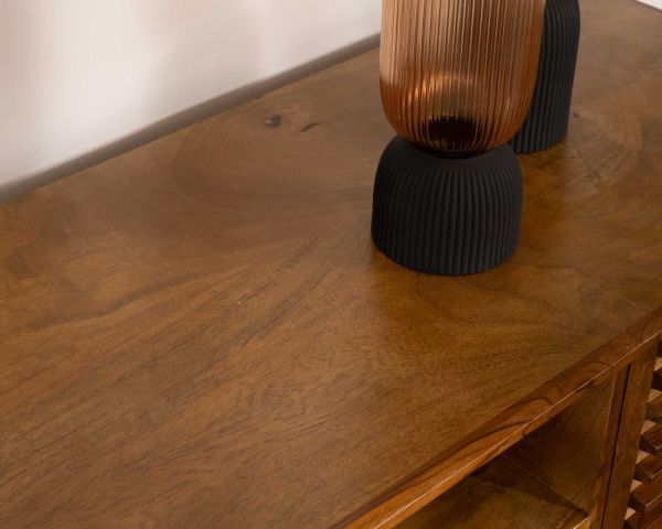 Immergetevi in un mondo raffinato e retrò con la collezione "Sheffield" e questo mobile TV in teak e mango dal design accurato e accattivante.