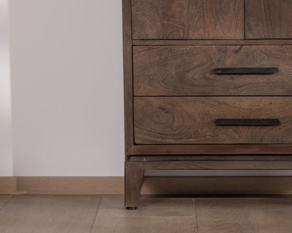 Con la sua silhouette senza tempo e il legno massiccio di mango, l'armadio Slody celebra il fascino sobrio dei mobili rivisitati di un tempo. Le sue ante massicce e i cassetti bassi creano un fronte equilibrato che è sia decorativo che funzionale.