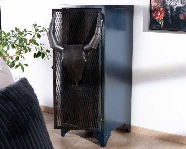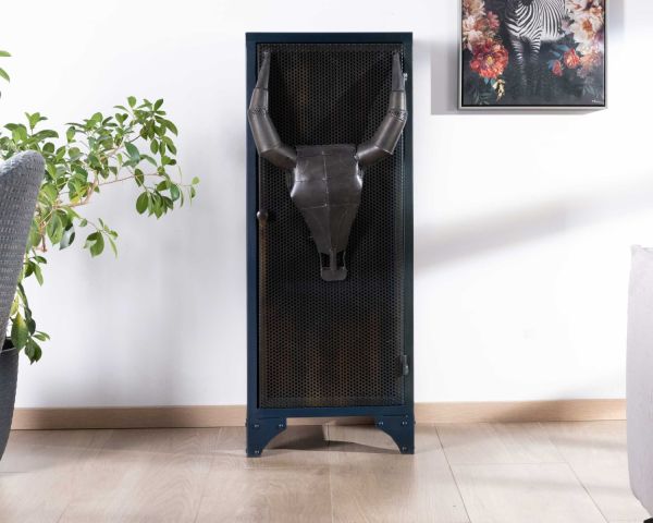La scultura metallica di una testa di toro in rilievo sull'anta conferisce a questo mobile un tocco originale e vi permetterà di fare un'audace dichiarazione decorativa.