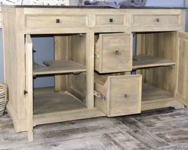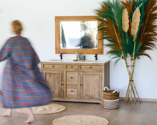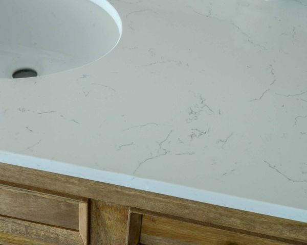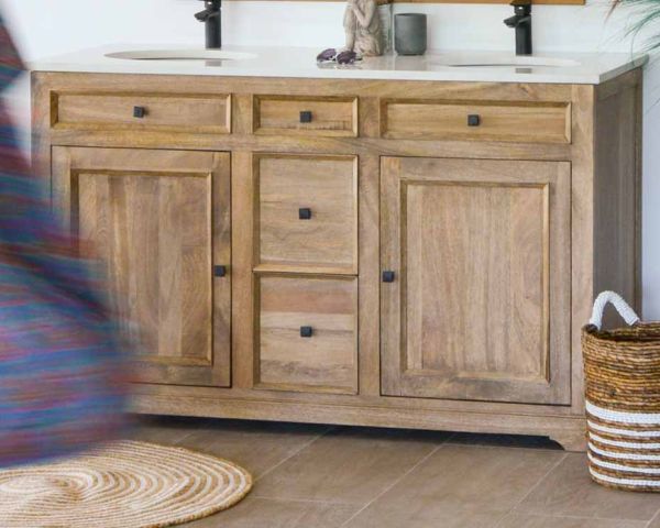 Materiali: Mango massiccio, piano in quarzo, lavabi in ceramica e MDF (base del mobile)
