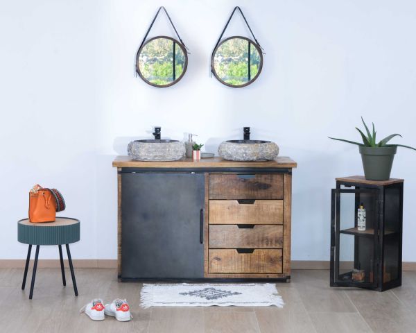 Cosa sarebbe un bagno senza un mobile di carattere? Questo mobile , realizzato in legno di mango e acciaio, alto 80 cm, permette di riporre tutti gli oggetti personali e di integrarsi nel bagno. Con una lunghezza di 120 cm, è abbastanza lungo per ospitare uno o anche due lavabi.