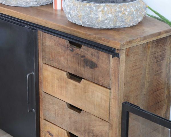 Poiché ogni mattina deve iniziare nel modo più bello, questo mobile utilizza materie prime eccezionali. Se si fa scorrere la mano lungo la sua parte superiore, si rimane piacevolmente sorpresi dal rilievo del materiale. Il legno di mango è stato volutamente lasciato grezzo per aggiungere ancora più carattere. A sinistra, una piastra d'acciaio scorrevole nasconde uno spazio che può essere utilizzato come contenitore per la biancheria sporca. A destra, i 3 cassetti scorrevoli del mobile offrono ampio spazio per i vostri effetti personali (cassetto superiore cieco).