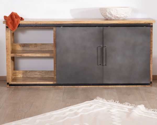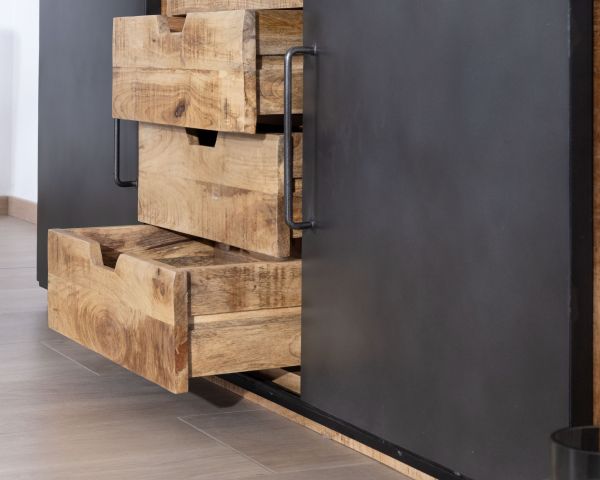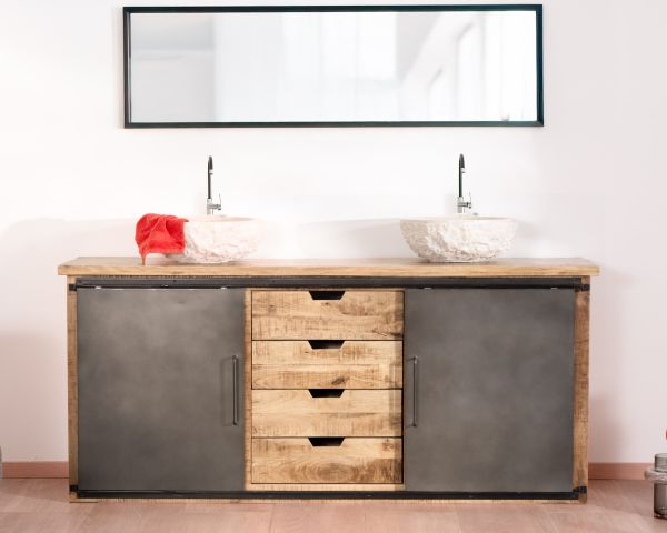 Con il suo aspetto industriale e la sua qualità artigianale, i suoi piani in legno di mango unici e leggermente ondulati, questo mobile "Caractère" diventerà un elemento essenziale del vostro bagno.