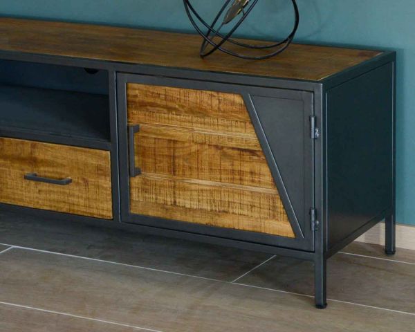 Collocato su una parete chiara o scura, farà sicuramente colpo. Il suo design combina il legno naturale di mango e il metallo grigio con grande effetto. Ci piace la texture in rilievo del legno, lo stile raffinato delle maniglie, l'aspetto "da officina" del metallo e il lavoro di saldatura più o meno visibile che aggiunge ancora più carattere. I frontali delle porte laterali sono rifiniti in due materiali per una finitura impeccabile. In breve, siamo amanti della personalità autentica dei mobili indus'.
