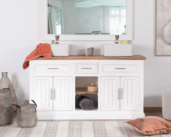 Combinando funzionalità ed estetica confortevole, questo mobile doppio in acacia della collezione "Trégastel" incarna l'armonia e il calore tipici delle case di vacanza della famiglia.