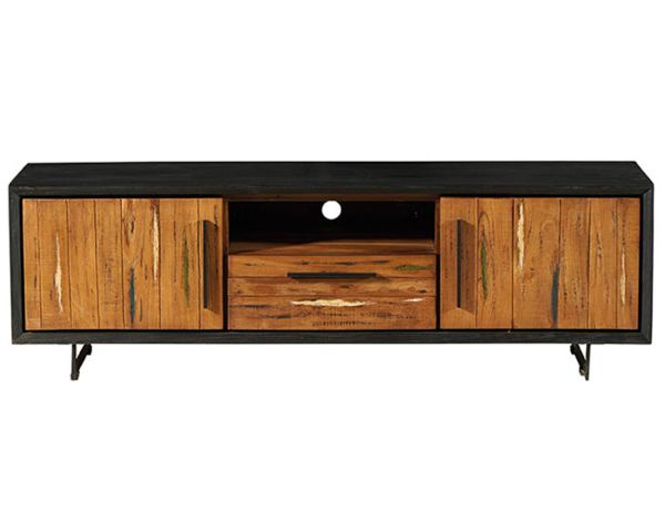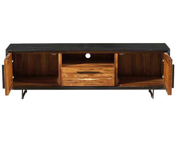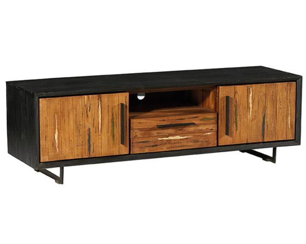 Combinando l'aspetto grezzo del metallo con il calore del legno di barca riciclato e del legno waru tinto di nero, questo porta TV è un esempio raffinato e moderno dell'arte di vivere.