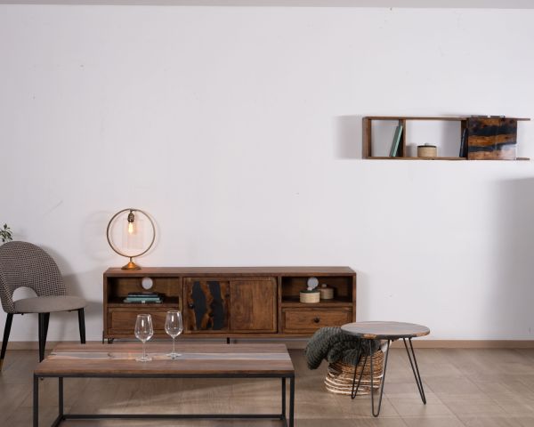 Con una lunghezza di 175 cm, una profondità di 40 cm e un'altezza di 60 cm, questo mobile TV offre molto spazio per riporre e organizzare tutti gli apparecchi e gli accessori per l'intrattenimento. Nelle due nicchie, nei due cassetti e nel vano centrale trovano posto in modo ordinato i vari lettori multimediali, le console di gioco, i DVD preferiti e i telecomandi. Il frontale dell'anta in legno massiccio, intarsiato con un motivo di resina grigia, sembra essere stato modellato dalla natura, quando nell'antichità il legno si congelava, intrappolando i tesori circostanti. A seconda della luce, la resina lucida e levigata assume un colore che va dal grigio-nero al grigio chiaro intenso, aggiungendo una nota vivace a questo mobile visivamente accattivante.