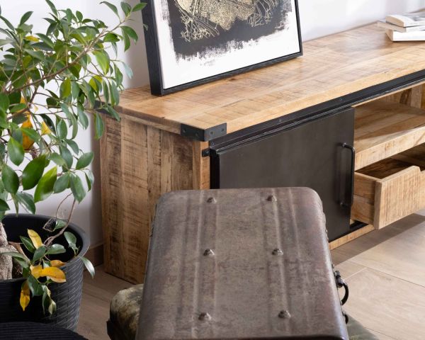 Per un design di carattere, scegliete il porta TV in legno di mango e metallo: i colori naturali del legno con finitura miele e il metallo grigio/nero si sposano perfettamente con un ambiente industriale. La sua solidità lo rende il mobile ideale per ospitare un televisore di grandi dimensioni e altri oggetti high-tech, sia che si tratti di uno spazio piccolo e lineare che di un soggiorno ampio e minimalista.