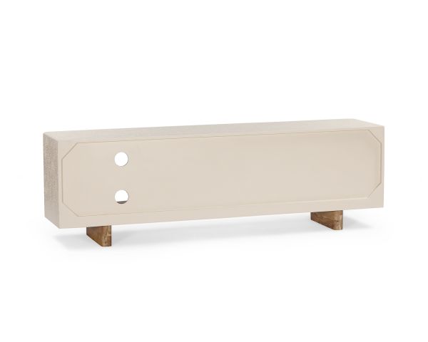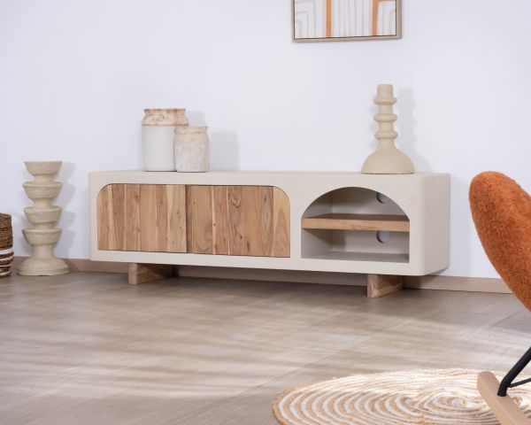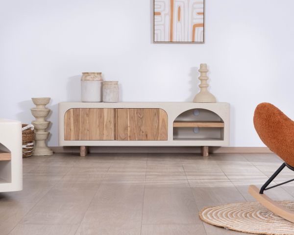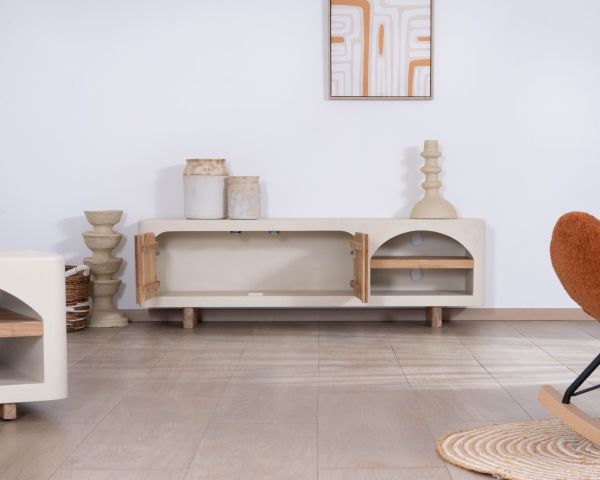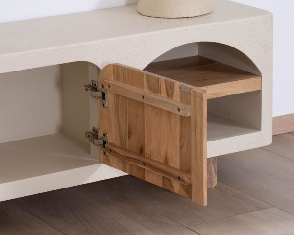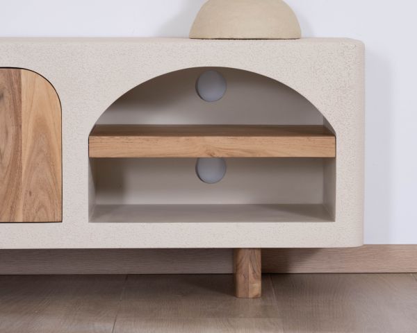 Struttura in MDF dalle linee morbide e pulite, con finitura in cemento sabbiato ed effetto pietra strutturata al tatto