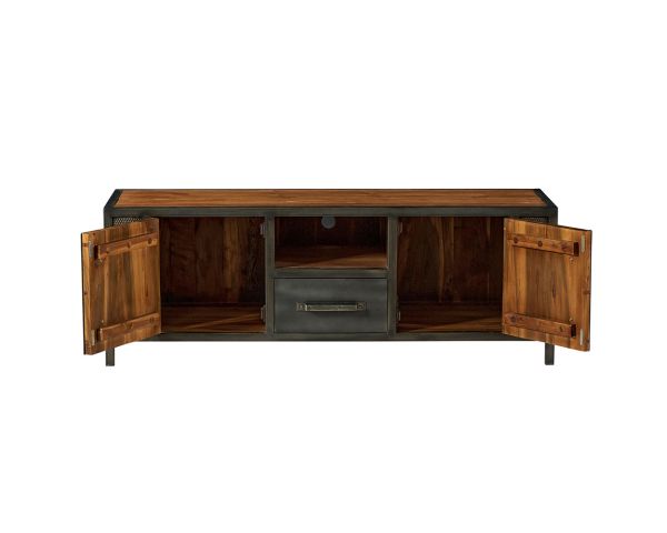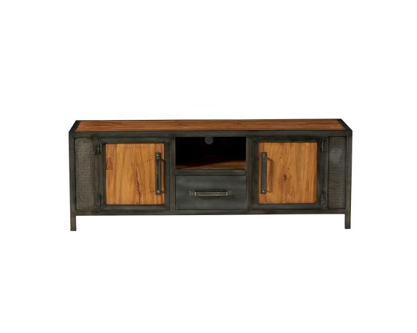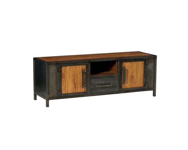 Questo porta TV in teak massiccio e metallo è un perfetto esempio di armonia tra robustezza ed estetica. Fa parte della collezione "Talmo" e unisce l'autenticità del teak recuperato alla solidità del metallo per un look decisamente factory.